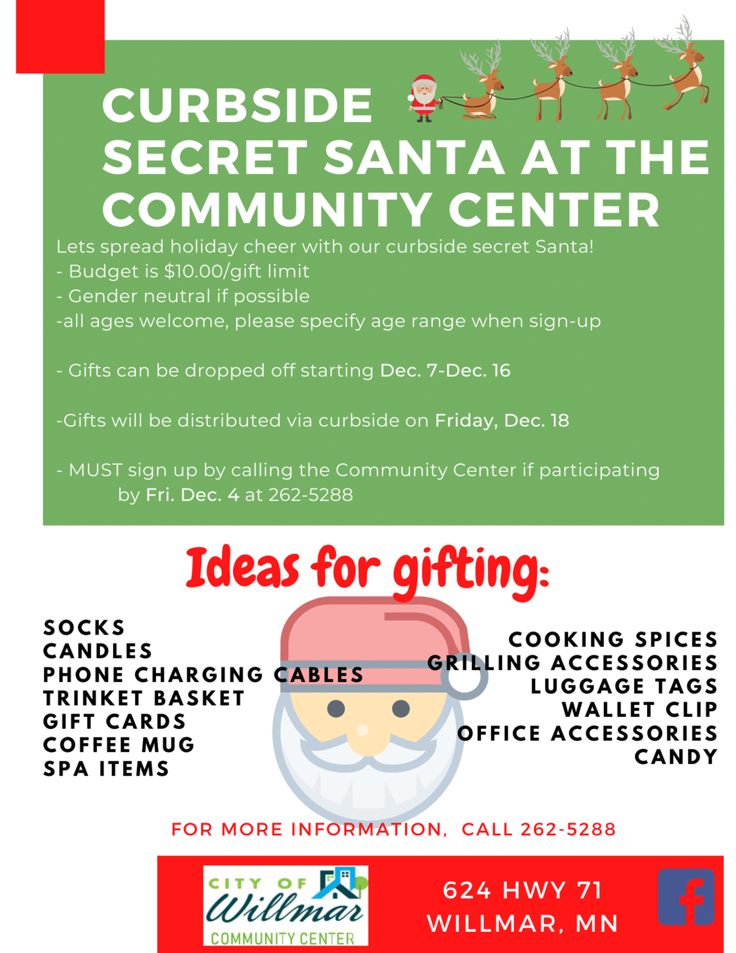 - Curbside Secret Santa at the Community Center and spread holiday cheer.